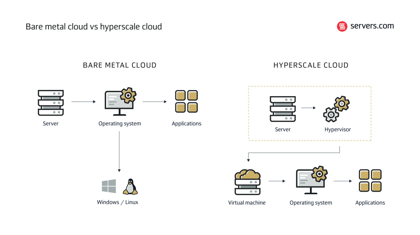 Hyperscale cloud servers are bare metal servers that have been virtualized. Using software called a ‘hypervisor’, the server hardware is divided across several virtual machines (VMs). Each VM can host its own OS, allowing one physical server to be shared across multiple tenants virtually. It’s not uncommon for dozens, or even hundreds of different businesses to be sharing a single hyperscale cloud server.