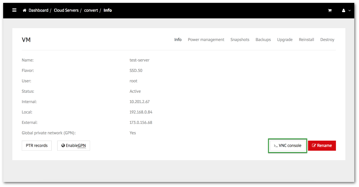 Before connecting to a server running Windows for the first time, you must set a password. To do this, go to Cloud Servers → Create & Manage, select the server ordered earlier. In the new window, click «> _VNC console».