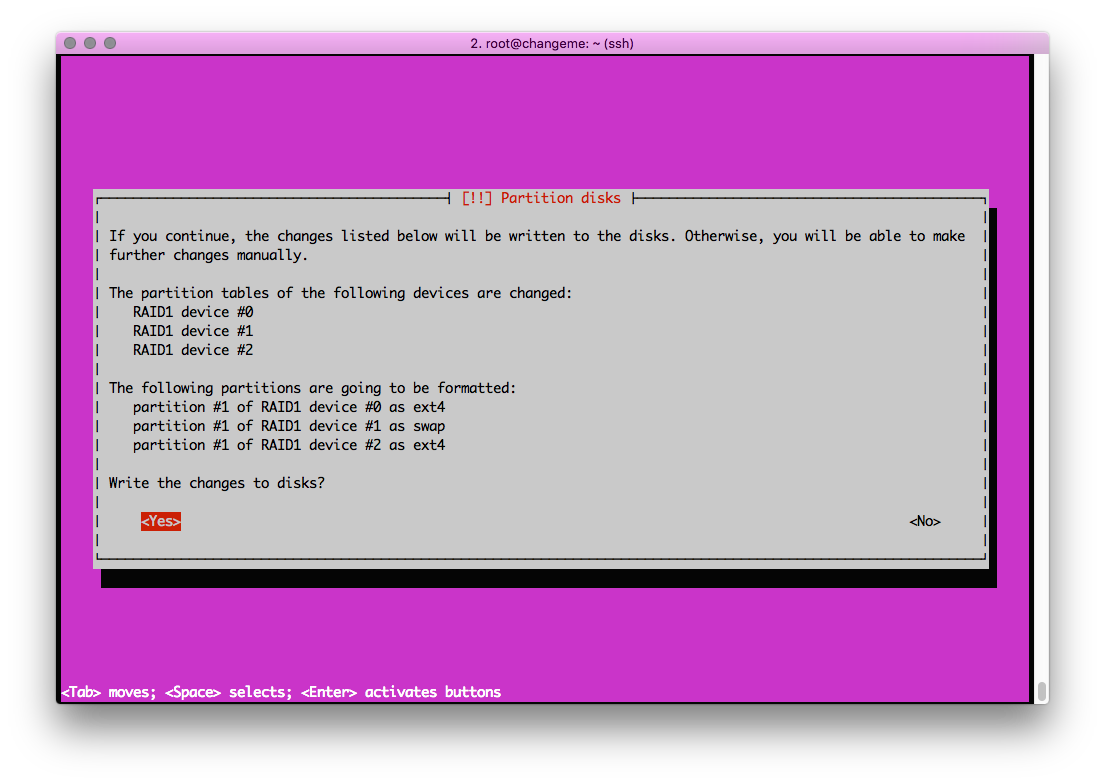8. After this operation, select software RAID. Indicate which partitionings are to be mirrored. Click Yes: